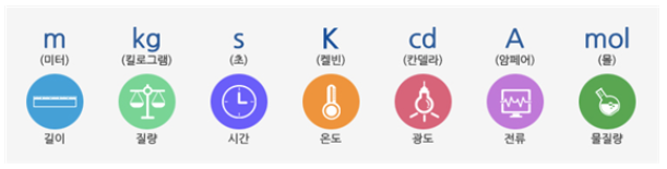 m (길이), kg (질량), s (시간), A (전류), K (온도), cd (조도, 칸델라), mol (물질의 양)