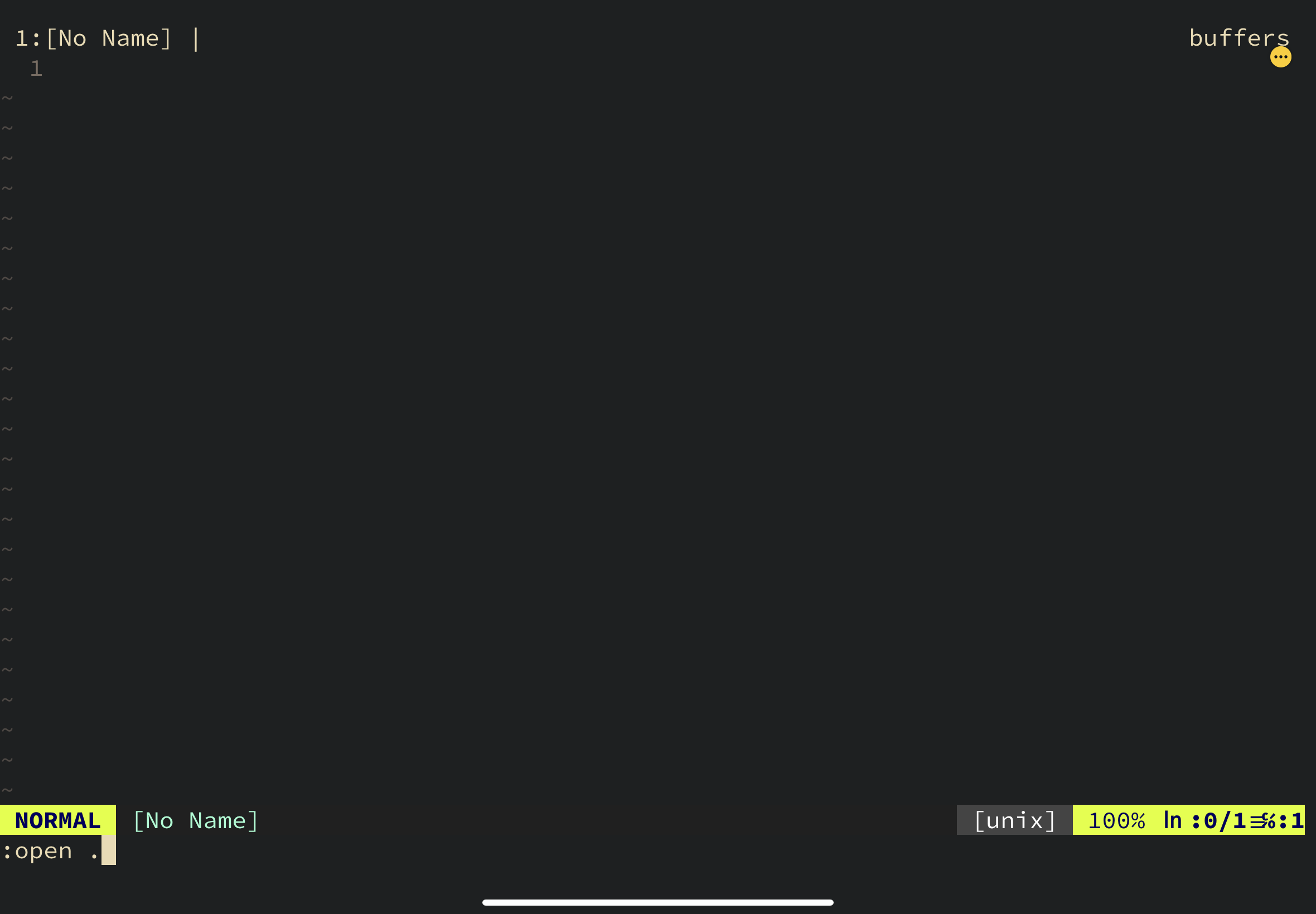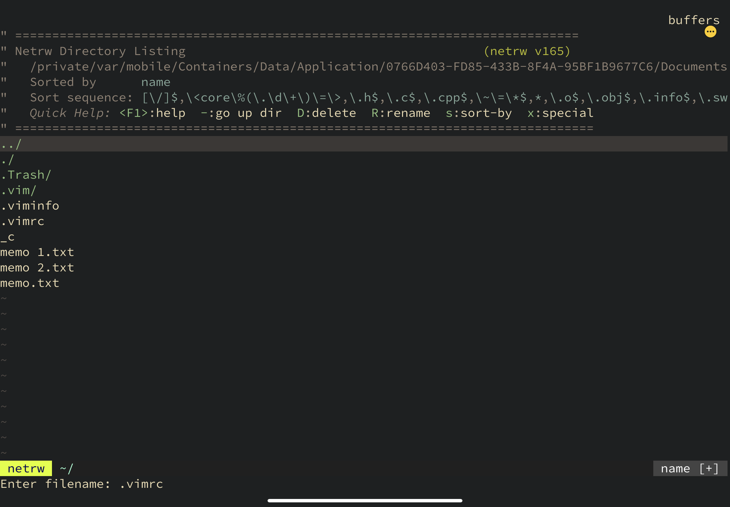 iVim은 기본으로 netrw가 설치된 상태라 위처럼 보이며 명령어 모드에서 %를 입력시 새로운 파일을 생성하기 위해 해당 파일의 입력을 요구한다. 여기서 .vimrc를 입력하고 엔터를 누르면 해당 파일을 작성할 수 있다.