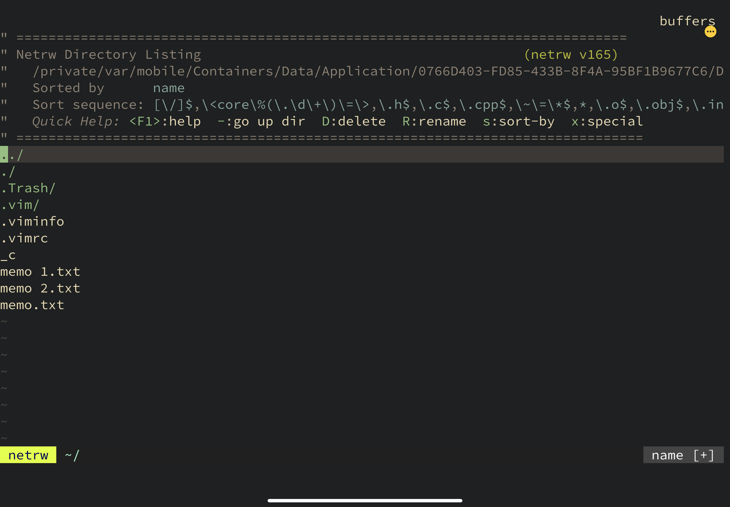 이후 현재 디렉토리에 있는 파일들이 보인다. 처음 iVim을 설치한 경우엔 .vimrc가 없으니 만들어주고 설정을 하면된다.