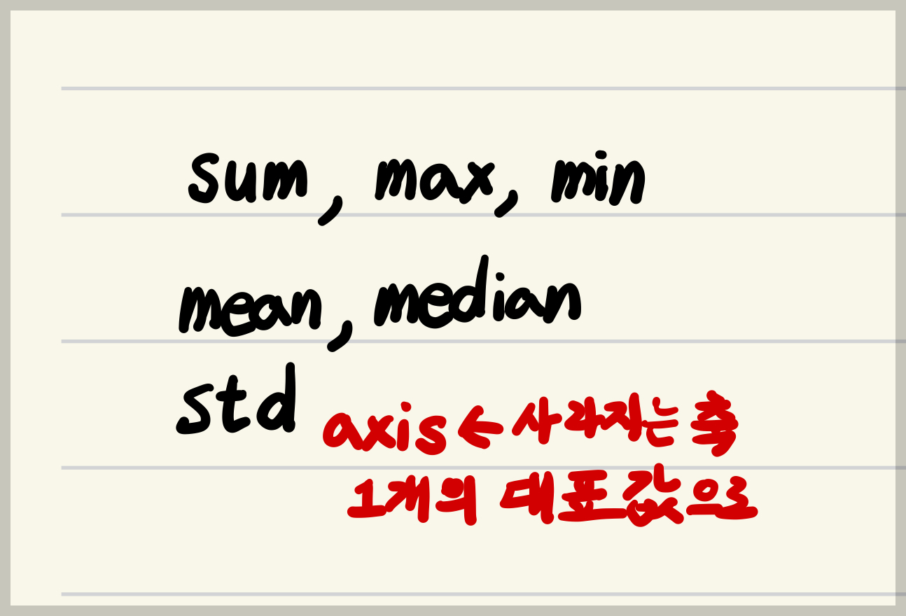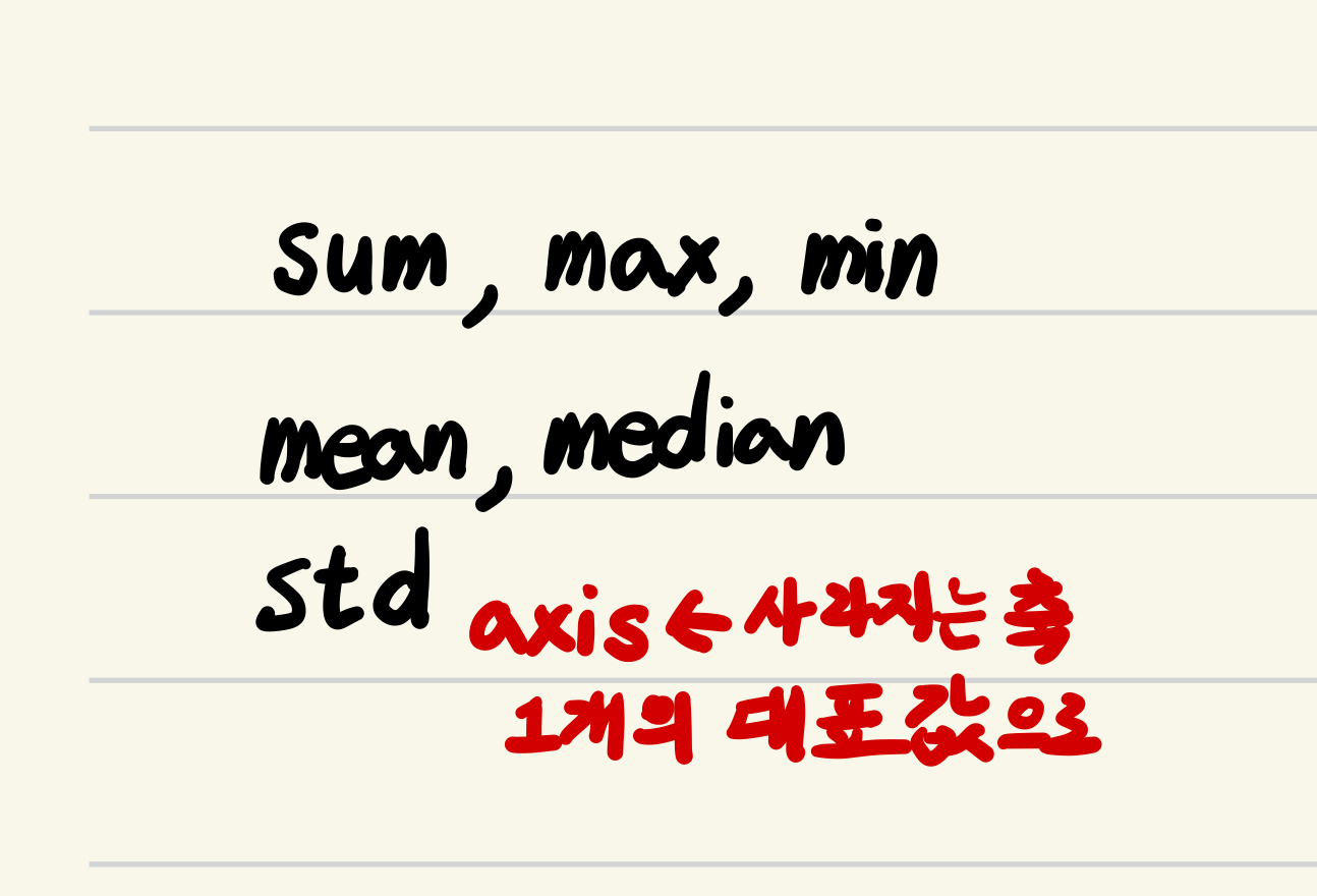numpy.max: 특정 축을 따라 최대값을 구함.numpy.min: 특정 축을 따라 최소값을 구함.numpy.median: 특정 축을 따라 median을 구함.