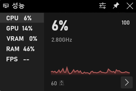 Windows 로고 키 + G를 누르고 나오는 성능 위젯을 이용.- 상단의 오른쪽에 있는 핀 모양을 클릭시 바탕화면에서 CPU 나 RAM의 사용량에 대한 모니터링이 가능함.