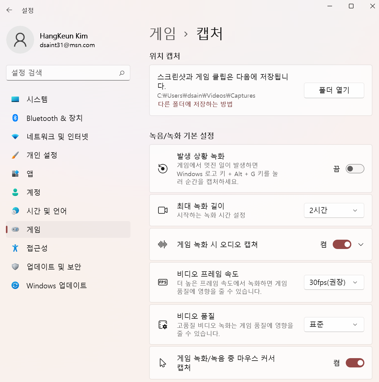C:\Users\[사용자명]\Videos\Captures가 지정되어 있음.