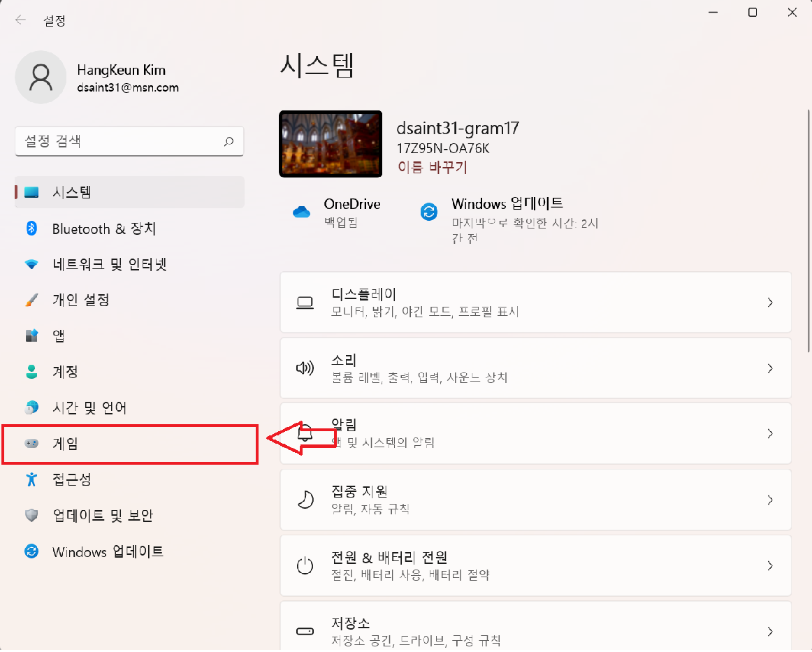 Windows11에서 설정 (윈도우키 누르면 나오는 메뉴에서 톱니바퀴 아이콘)을 누르면 다음과 같은 설정창이 뜸.