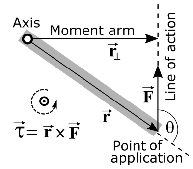 다음 그림은 moment of force(=torque)에서 힘의 작용점(point of application)과 방향(line of action), 그리고 회전축과 moment arm간의 관계를 보여준다.