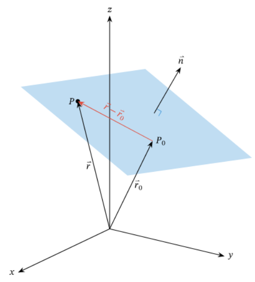 Position Vector $\textbf{r}$과 $\textbf{r}_0$로 표현됨. - $\textbf{n}$은 평면에 대한 Normal Vector (법선벡터)임.