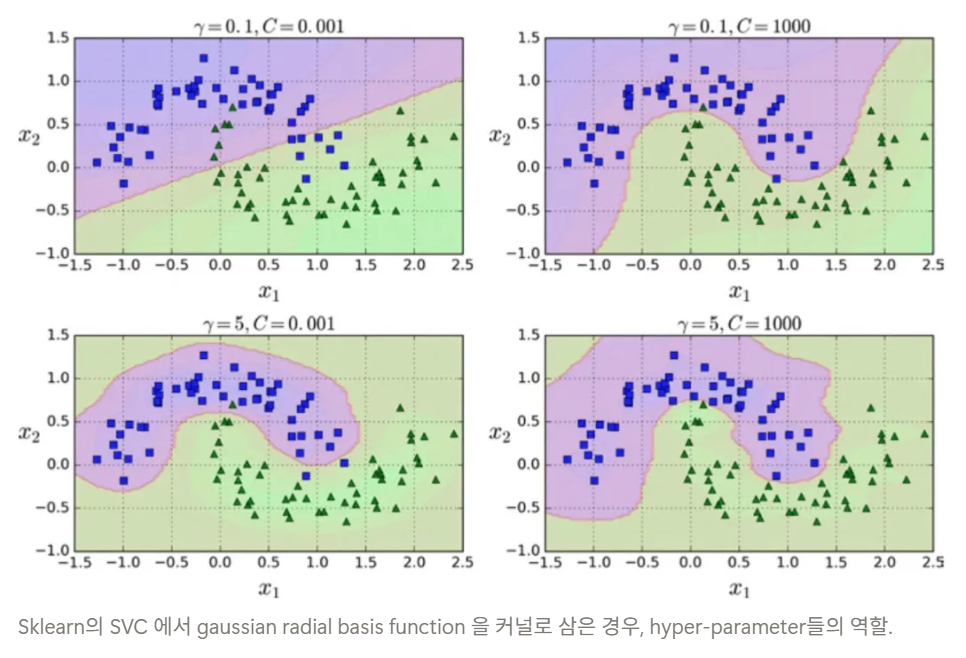 - 단, (Kernel)SVM 의 성능은 hyper-parameter ($C$, $\gamma$) 및 kernel 에 매우 민감한 영향을 받음.