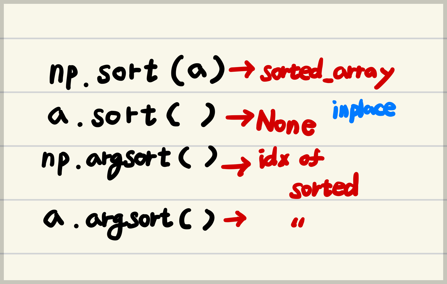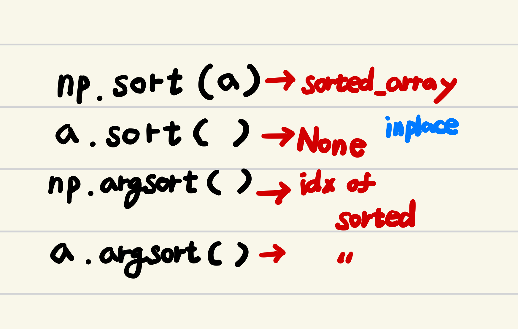 실제 sort의 결과를 index로 처리하도록 해주는 argsort의 활용도 자주 있으므로 익혀두는게 좋음.
