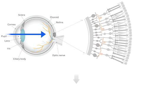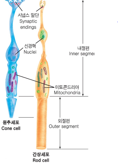 - cone cell이 색을 인지. (rod cell보다 수가 적고 sensitivity가 낮음)