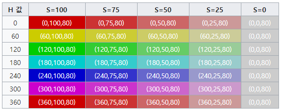 - S : Saturation (채도 : 색상의 탁하고 맑음의 정도)