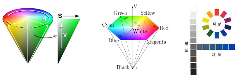 - V 또는 I : Value or Intensity, Lightness(명도) : 밝기의 정도