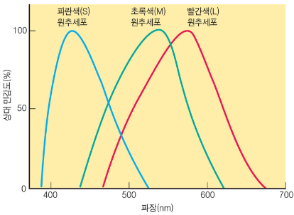 3가지 종류의 cone cell에 대해 각 color에 대한 상대민감도는 다음과 같음 (겹쳐있어서 기계적으로 한종류만 activation되진 않음)
