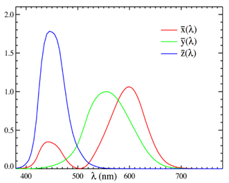 - 인간의 cone cell에서의 감응도를 기반으로 인간이 인식할 수 있는 모든 색 을 linear combination으로 표현할 수 있도록 정의된 세 개의 가상의 기본 색 함수( imaginary primary functions)임.