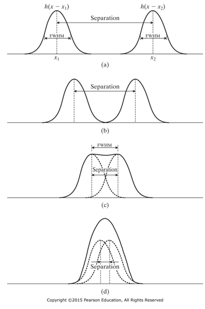 - 만일 2개의 점 혹은 선이 FWHM보다 적은 거리에 놓여있다면, 해당 영상시스템의 결과 영상에서는 2개의 점 혹은 선이 붙어있는 것으로 표시되며 이를 구분할 수 없다.