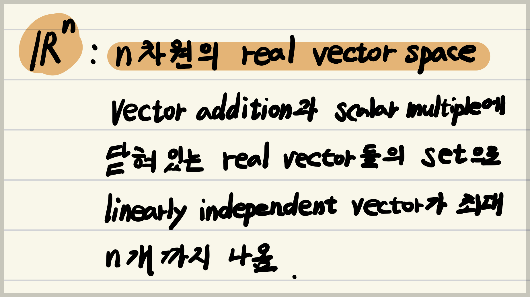 - linear algebra에서 가장 기본적인 vector space로 만나게 되는 녀석임.
