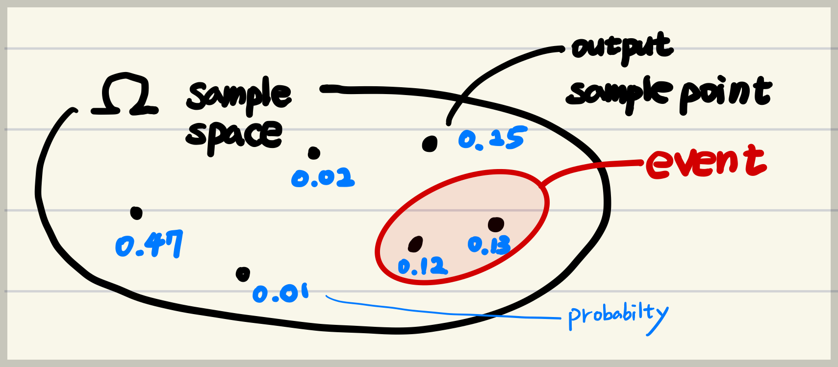 - event(사건) 은 일어날 수 있는 output(or sample point)들을 element로 가지는 set임: 즉, sample space의 subset