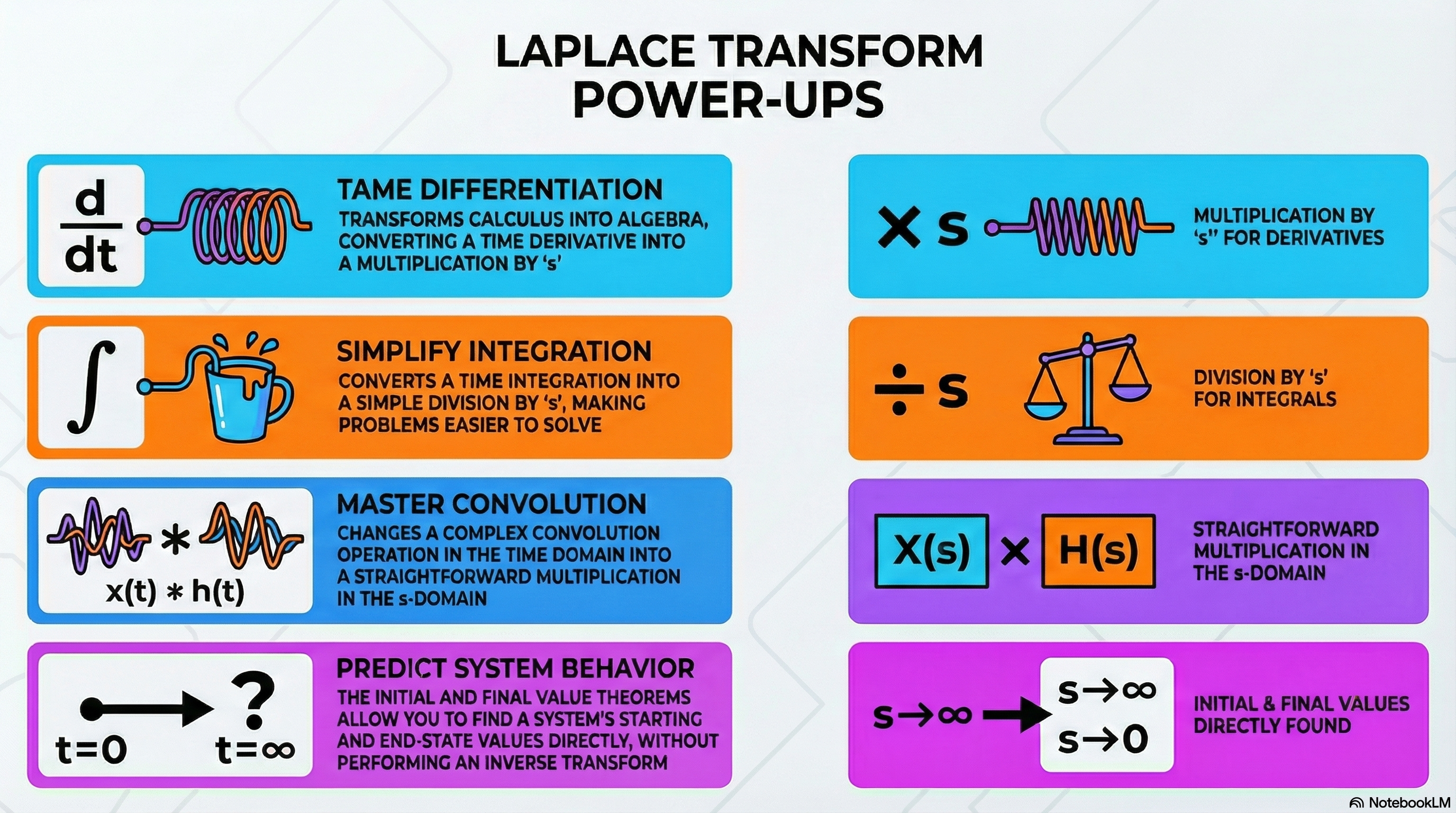 다음 성질들은 미분방정식에서 Laplace Transform이 빛을 발하는 강점인 성질들임.