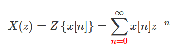 $$ X(z)=Z \left \{ x[n] \right \}=\sum_{\color{red}{n=0}}^{\infty}x[n]z^{-n} $$