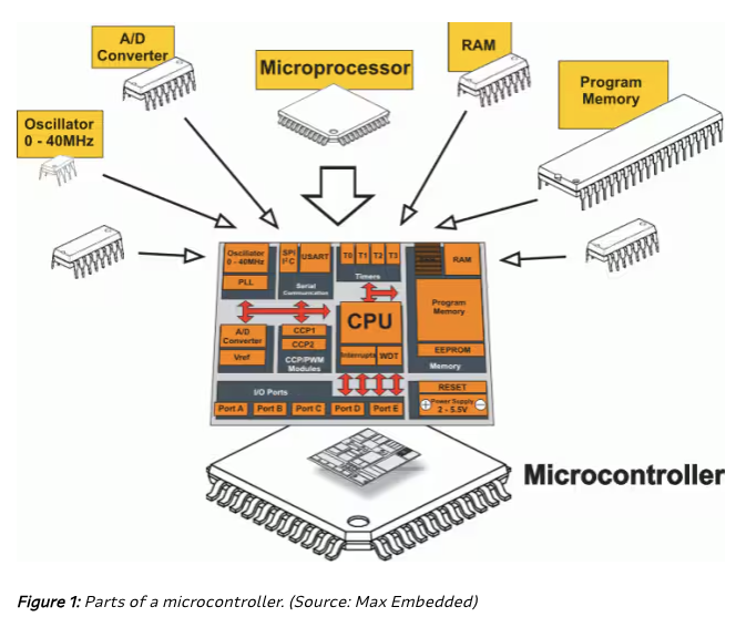 - 즉 MCU는 processor core에 memory, i/o가 하나의 chip 으로 패키징 된 것을 가르킴: Micro-Processor와의 차이점.