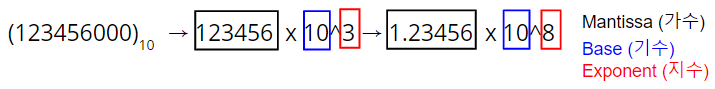 - Mantissa : 표현가능한 유효 숫자에 해당함. Mantissa의 길이가 precision을 결정.