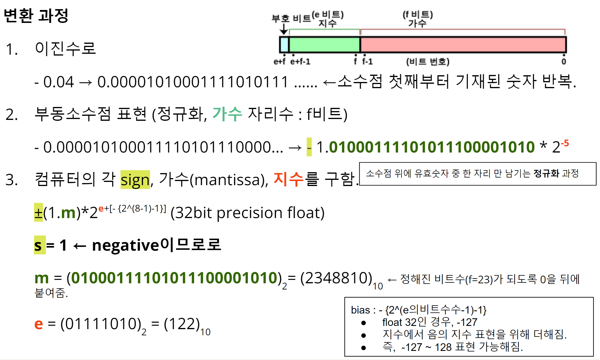 - 3번에서는 exponent를 구하는 과정으로 이진수이니 base가 2이고 지수(exponent)부분에서 $\text{bais} = - (2^{\text{bit_size_of_e}-1}-1)$를 더해서 2번에서 구한 지수부(위의 예제에선 $-5$)가 나오도록 exponent를 구함. 위의 예에서 bias는 exponent를 위해 할당된 bit수가 8이므로 $-(128-1)=-127$이되며, $-5=e-127$이므로 $e=122$(10진수표현)가 된다.