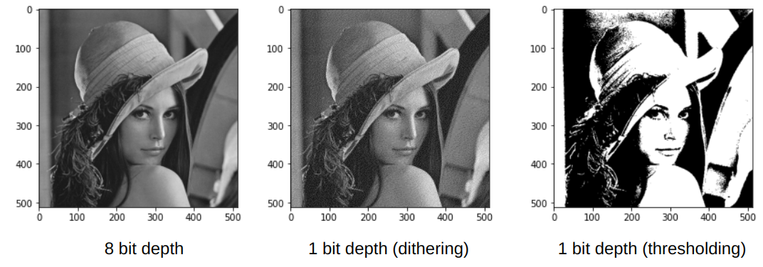 실제로 256 단계의 gray-scale이미지를 0,1의 binary image (or monochrome image)로 변환하면 quantization error로 인해 매우 image가 부자연스러워보인다. Dithering은 ideal 하게 quantization하면 bit-depth의 부족으로 인한 quantizaiton error가 심할 경우, 주변 pixel들의 값을 고려하여 의도적으로 noise를 삽입함으로서 사람이 느끼기에 0,1로만 구성된 pixel임에도 해당 pixel들의 밀도에 의해 명암을 느끼게 해주는 방법이다.