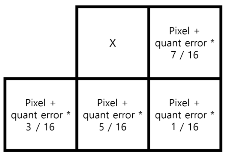 가장 유명한 dithering 방법은 Floyd-Steinberg dithering으로 quantization error를 밑의 3개의 pixel과 오른쪽은 1개의 pixel에 전달하고나서 thrsholding하면 된다. 오류 전파 정도는 아래 그림(from : https://wh00300.tistory.com/223)을 참고하라.