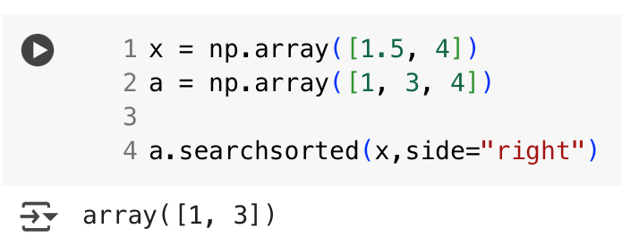 ndarray의 shape는 query에 해당하는 B와 같다. - 기본으로는 left를 기준으로 index를 반환한다. 같은 값이 이미 존재하는 경우, 해당 값의 위치의 left에 삽입하는 것으로 생각하고 index 반환.