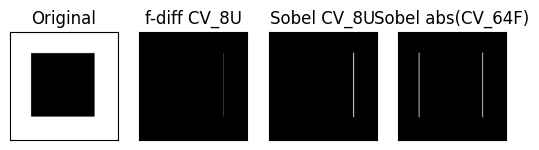 위의 결과는 forward difference 와 Sobel filter를 수행할 때, cv2.CV_8U를 사용하면 안되는 이유를 잘 보여준다.