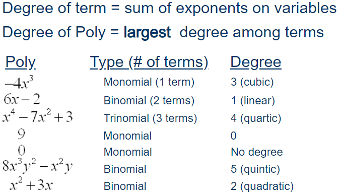- $3x^2y^3+2x^4$ 의 polynomial의 degree는 첫 번째 term에서의 $x$에서의 exponent인 2에 $y$의 exponent $3$을 더한 $5$임.
