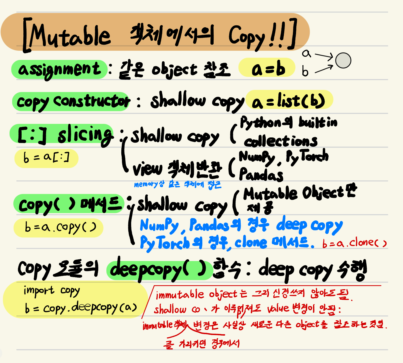 단, immutable의 경우와 달리 mutable object에 대한 variable을 이용한 copy constructor에서는 새로 memory할당이 된 object를 가리키게 된다.