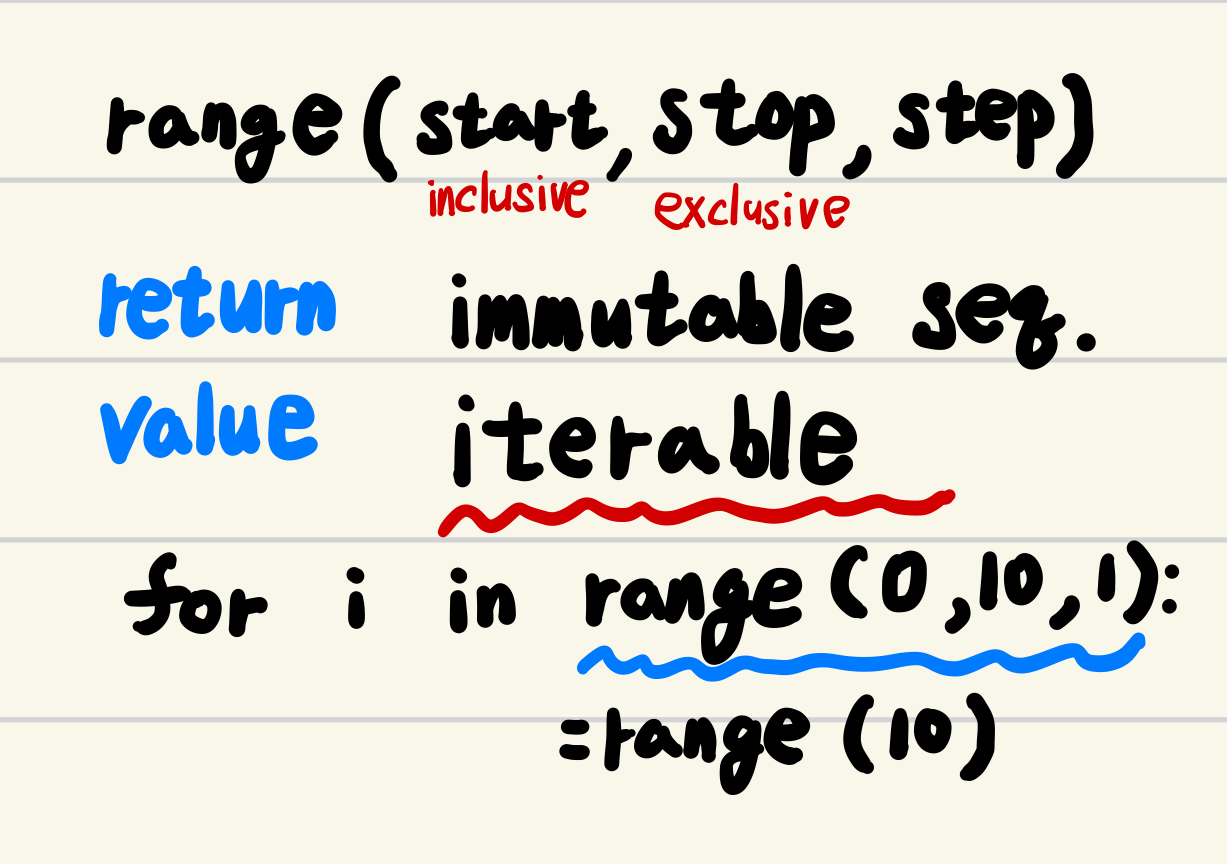 흔히 argument를 하나만 줄 경우, start=0, step=1로 기본 할당되고, 주어진 argument는 stop으로 동작한다.