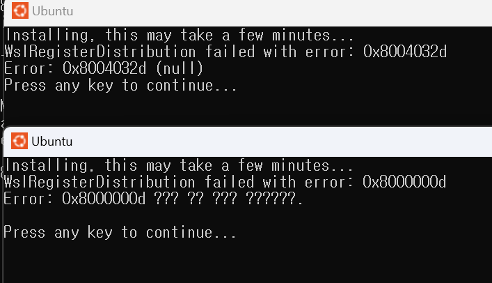 WSL을 설치하다 다음의 에러를 발생하는 경우가 있음(Windows10에서 설치하다 발생함)우선기본 Distribtion이 설치가 안 되고,재부팅 등을 해도 이 두 에러코드 중 하나를 출력하면서 WSL에 동작하지 않