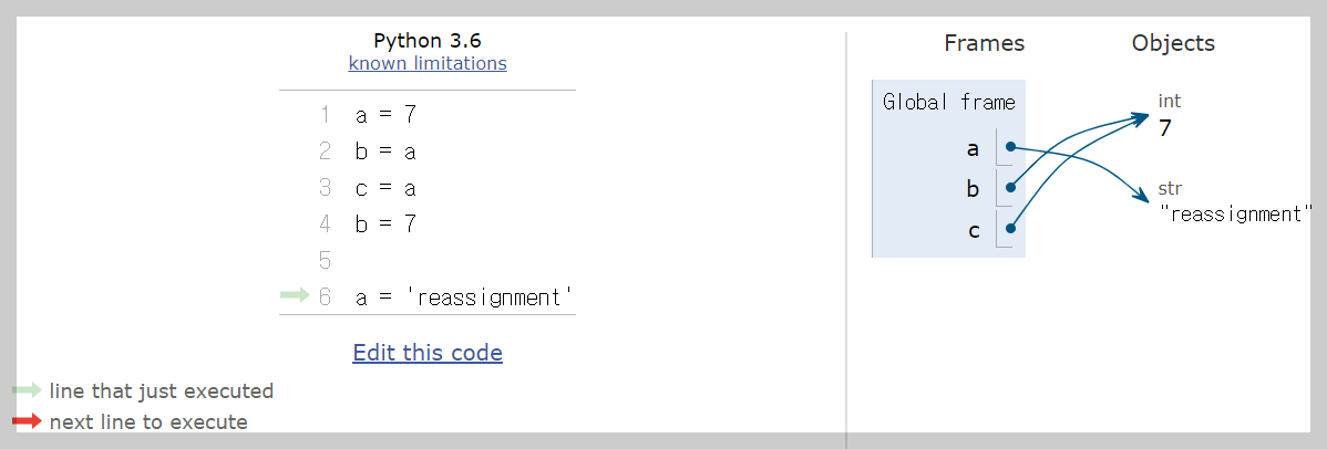 만약 a = 'reassignment'를 수행하면 다음과 같이 a는 다른 object를 가리키게 된다 (마치 type이 변한 것처럼 보일 수 있음).
