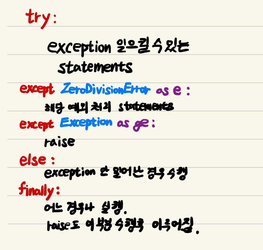 finally블럭은 생략가능함 - 꼭 마지막에 처리해야 하는 코드들이 있는 경우 사용. except블록에서 처리하지 않는 Exception들은 Python interpreter에게 전달되고 프로그램 종료로 이어짐.raise를 이용하여 except에서 처리하고 해당 exception을 다시 interpreter에게 넘길 수도 있음. (이 경우 프로그램은 exception으로 종료됨)raise ValueError('invalid argument')와 같이 특정한 exception을 발생시키도록 처리할 수도 있음.