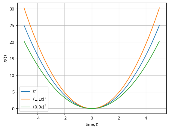 다음 그림은 $x(t)=t^2$ signal과 이를 $a=1.1$과 $a=0.9$로 scaling 시킨 signal을 waveform으로 나타낸 것임.