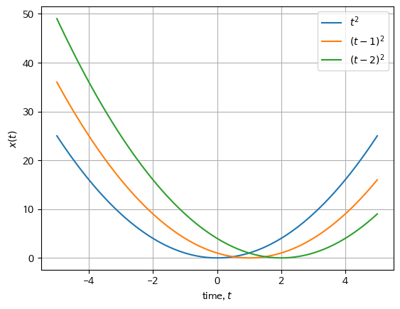 다음 그림은 $x(t)=t^2$ signal과 이를 1, 2로 shift 시킨 signal을 waveform으로 나타낸 것임.