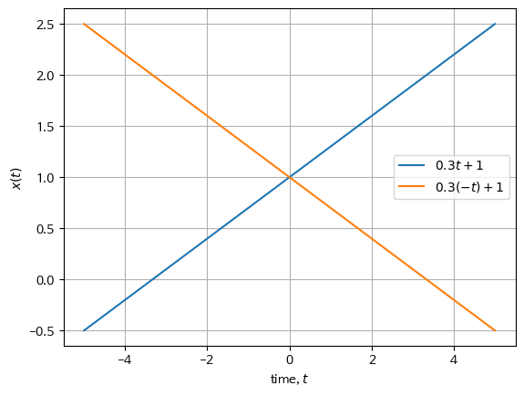 다음 그림은 $x(t)=0.3t+1$ signal과 이를 reflection shift 시킨 signal을 waveform으로 나타낸 것임.