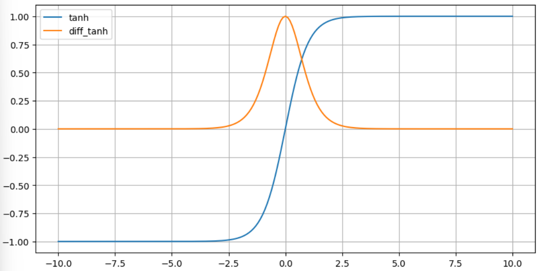 다음은 $\text{tanh}(x)$와 derivative를 같이 그린 그림임.