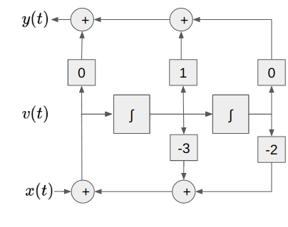 y(t) = D^{-1} \frac{x(t)}{1+3D^{-1}+2D^{-2}} \\ y(t) = D^{-1} v(t)