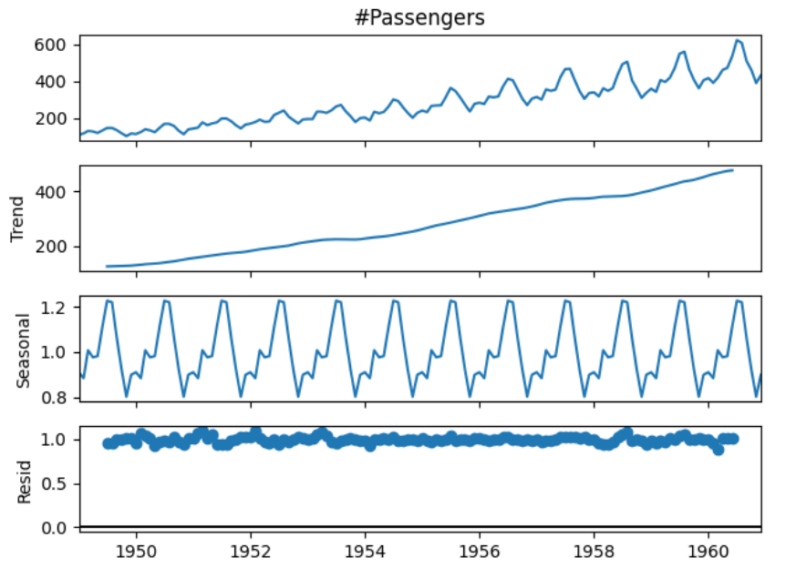 result_m = seasonal_decompose(series, model='multiplicative') #additive multiplicative