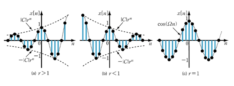 이는 $r = e^{\sigma}$의 값에 따라 증가, 감소, 또는 discrete sinusoidal 중 하나가 됨.