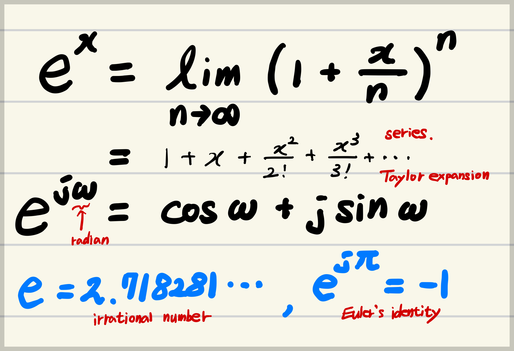 $$ \begin{aligned}e^x &= \underset{n \to \infty}{\lim} \left( 1+\frac{x}{n}\right)^n \\ &= 1+x + \frac{x^2}{2!}+\frac{x^3}{3!} +\dots \end{aligned} $$