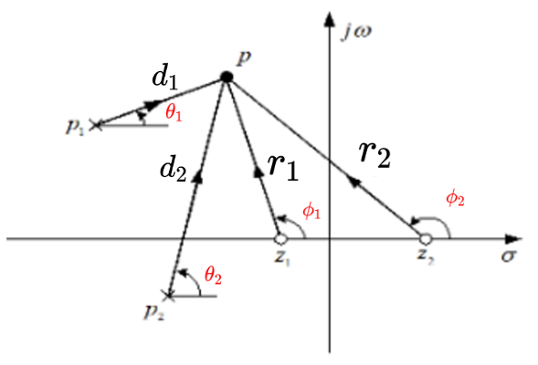 $$ \left. \angle H(s) \right | _{s=p} = \phi_1+\phi_2 - \theta_1 -\theta_2 $$
