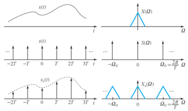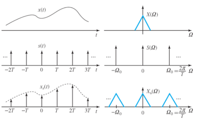 $$ x_s(t)=x(t)s(t) \underset{\text{CTFT}}{\longleftrightarrow}X_s(\Omega)=\dfrac{1}{2\pi}X(\Omega)*S(\Omega) $$