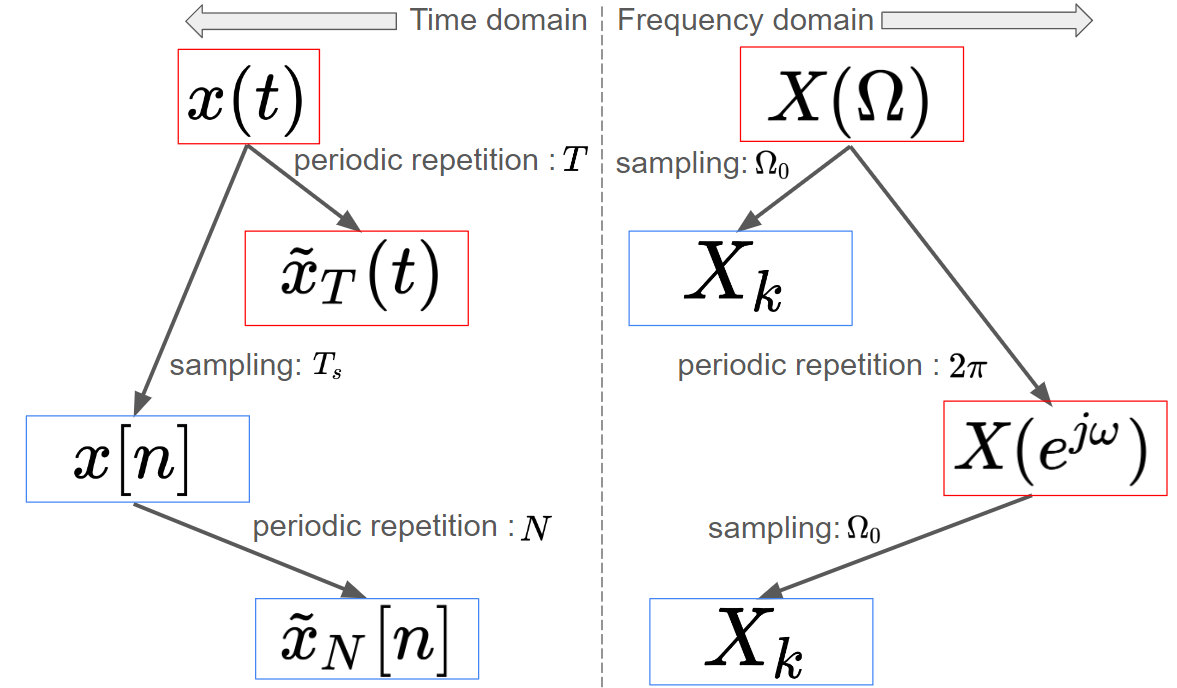 Discrete signal의 spectrum은 Periodic(주기) 함수임. - CTFT와 DTFS는 자체적으로 duality이 성립 : (아래 관계도 2참고)