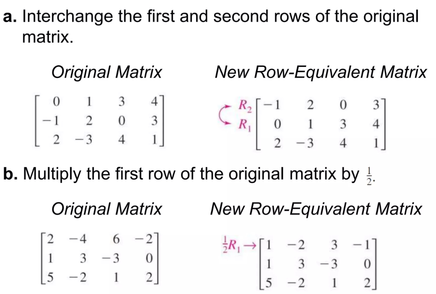 Row Operations은 Matrix의 Row에 적용되는 Operations로, 다음 세 가지 기본 유형이 있음: