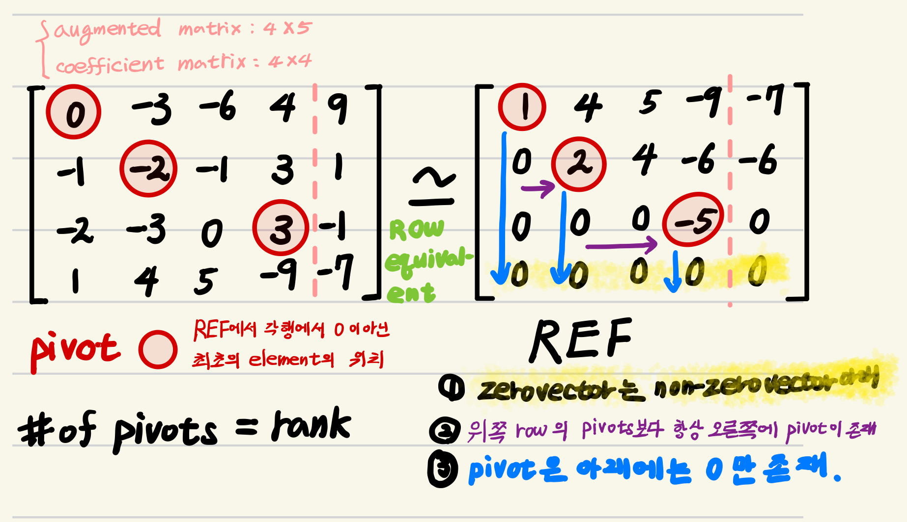 - RREF에서 pivot은 해당 column에서 유일하게 0이 아닌 수임.