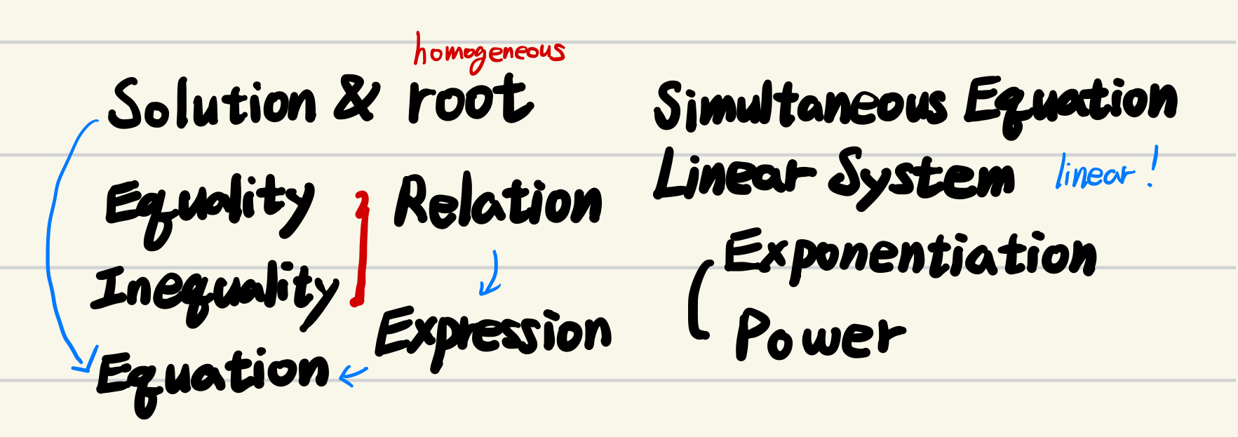 - 흔히, unknown(미지수, 문자로 표현)를 포함하는 Left Hand Side(LHS)와 Right Hand Side(RHS)로 구성된 등식(equality)으로
