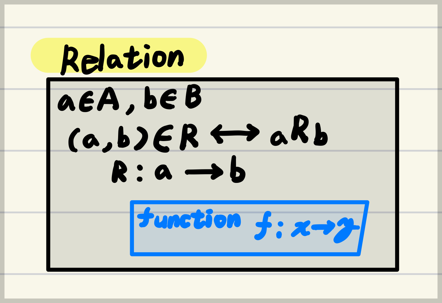 일반적으로 set 에서 출발하여, relation 을 거쳐, function 으로 이어지는 형태로 개념이 확장된다.