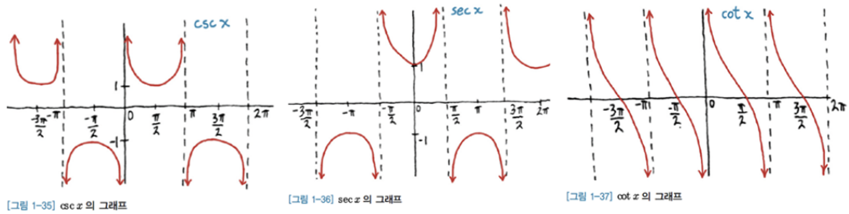 위의 삼각함수의 reciprocals(역수, inverse functions 아님)는 다음과 같음 (이들도 삼각함수임).